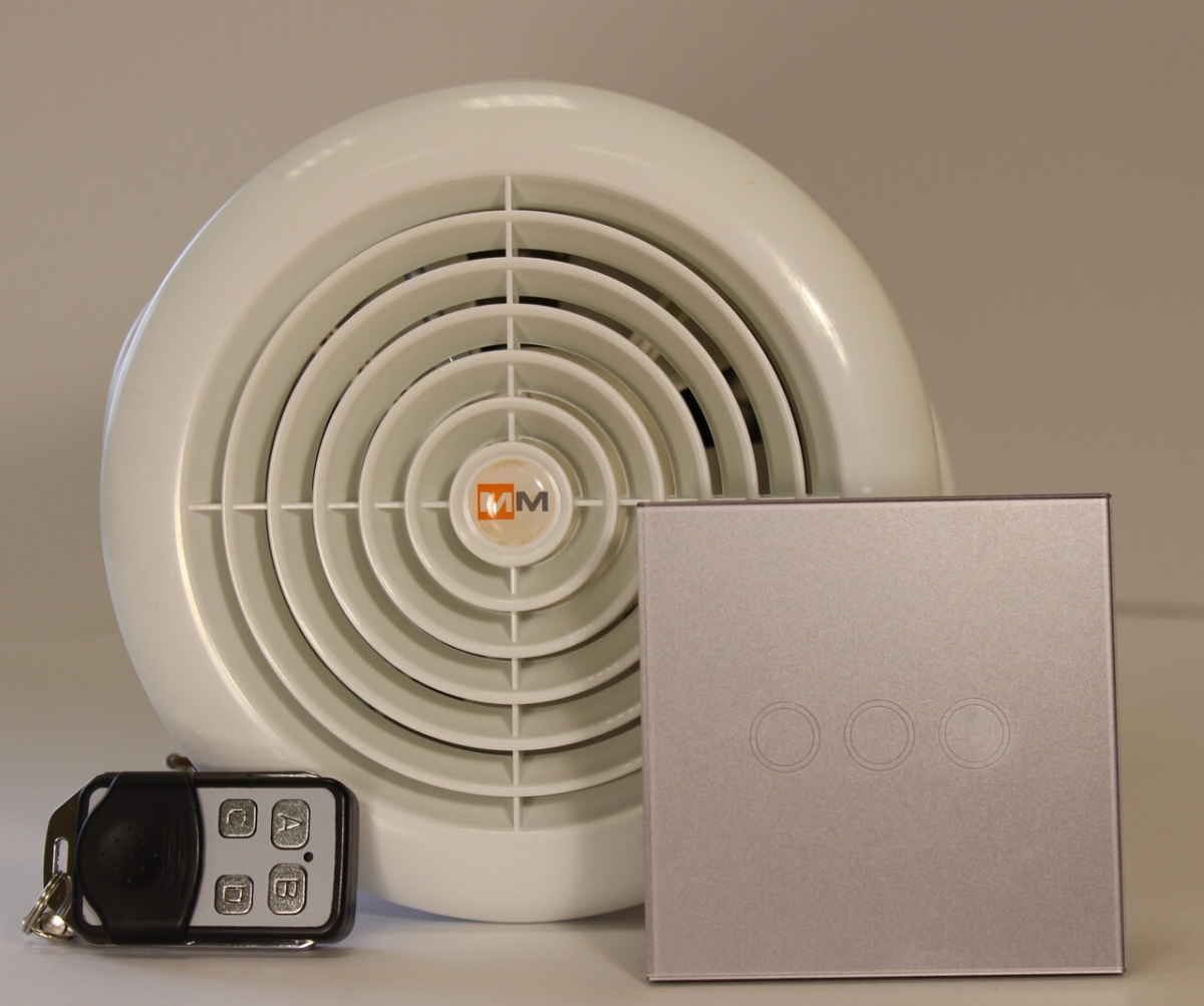 TkV-03 RF-SW "Сибирь" приточная с подогоревателем. Беспроводный пульт ДУ (радиоканал 433 МГц) в комбинации с настенным сенсорным переключателем, управление по Wi-Fi. 3 скорости, 30/70/100 м³/ч, 800 Вт (эл. Калорифер) + 18 Вт (вентилятор), встроенный термостат (менее +16ºС- вкл., более +23ºС- выкл.), обратный клапан, фильтр (угольный + G4). Минимальная толщина стены 270 мм, Ø 150 мм . Внутренняя решётка — круглая, белая