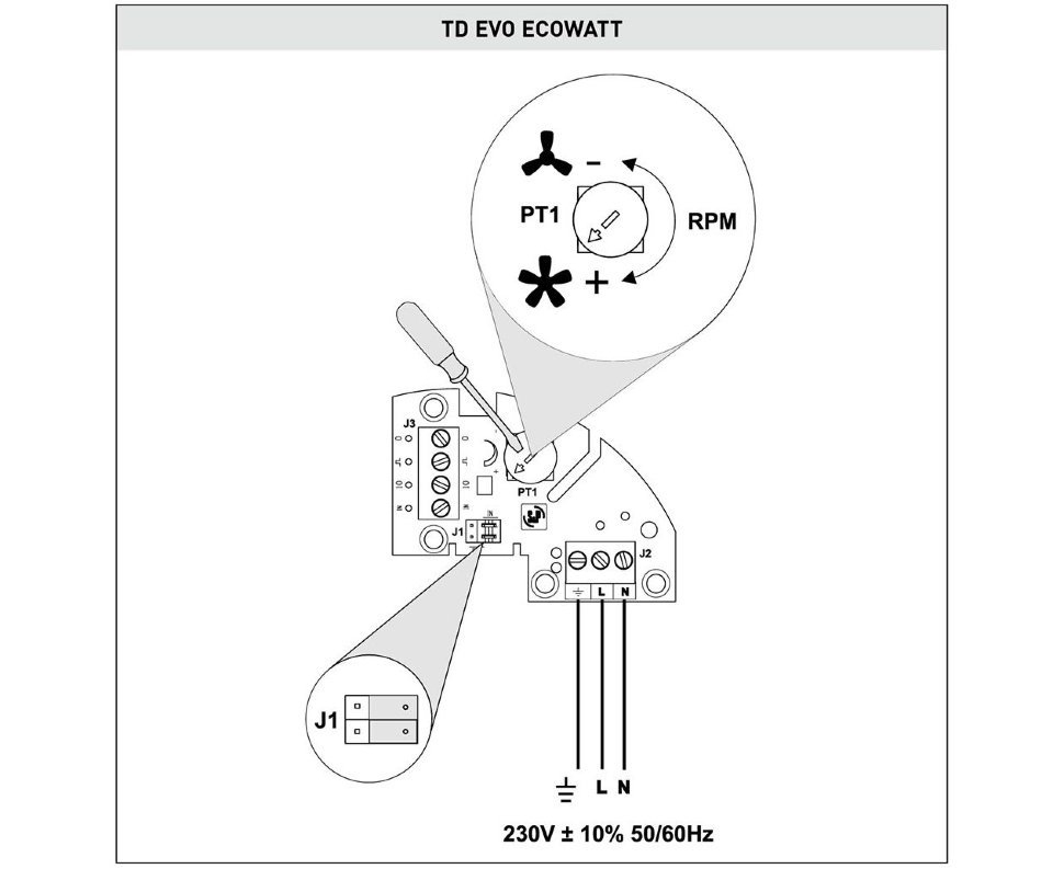 - Скорость вентиляторов регулируется в диапазоне от 10% до 100% при помощи потенциометра, расположенного в клеммной коробке или при помощи внешнего потенциометра REB-ECOWATT (опция).