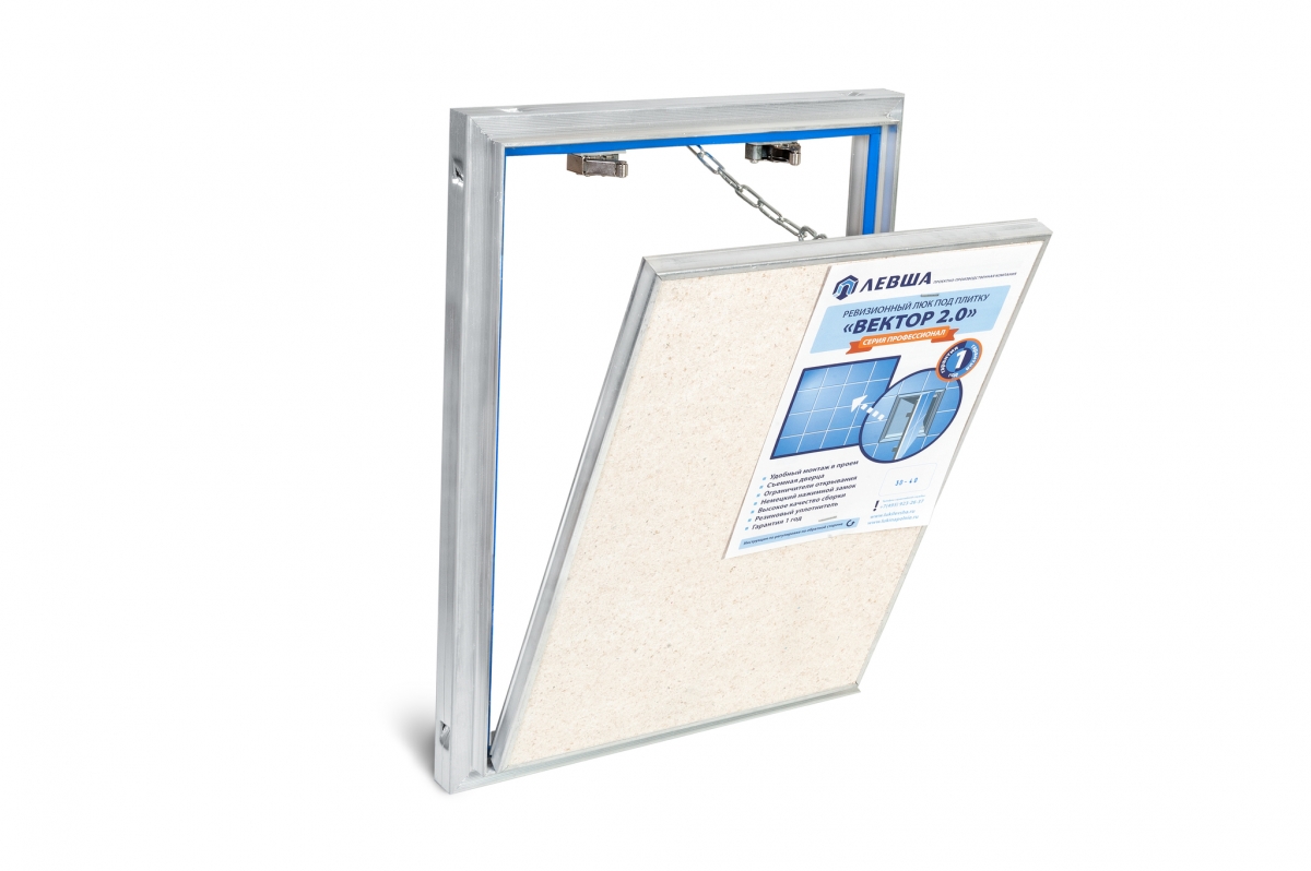 Люк под плитку «ВЕКТОР 2.0» повышенной прочности и жесткости с откидной, съемной дверцей, на которую наклеится абсолютно любые листовые отделочные материалы (керамическая плитка, керамогранит, натуральный или искусственный камень, различные композитные материалы и др.).