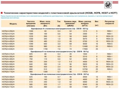 Компактные осевые вентиляторы с монтажной пластиной серии HCFB комплектуются пластмассовыми крыльчатками (типоразмеры от 250 до 630) или крыльчатками с алюминиевой ступицей и с пластмассовыми лопатками (типоразмеры от 710 до 1000).