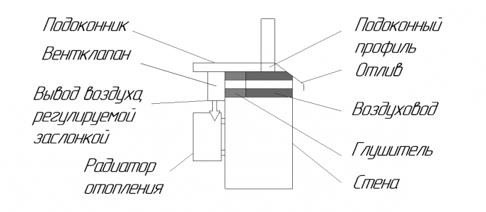 Оголовок клапана (высота 51 мм) с G3 фильтром будет находиться и крепиться под подоконником над радиатором с выходом воздуха на радиатор отопления, воздуховоды - плоские, будут монтироваться в нишу между оконным профилем и оконным стеновым проемом (монтажнику окна необходимо предусматривать там зазор 50мм), далее выходить под отлив и закрываться им.