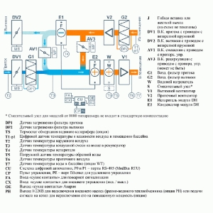 - Возможные опции PH нагрев воды в бассейне WT температура воздуха по температуре воды PW дополнительный водяной калорифер CF дополнительный охладитель и управление ККБ CH переключение тепло-холод CE выносной конденсатор и переключение тепло-холод DS диспетчеризация.