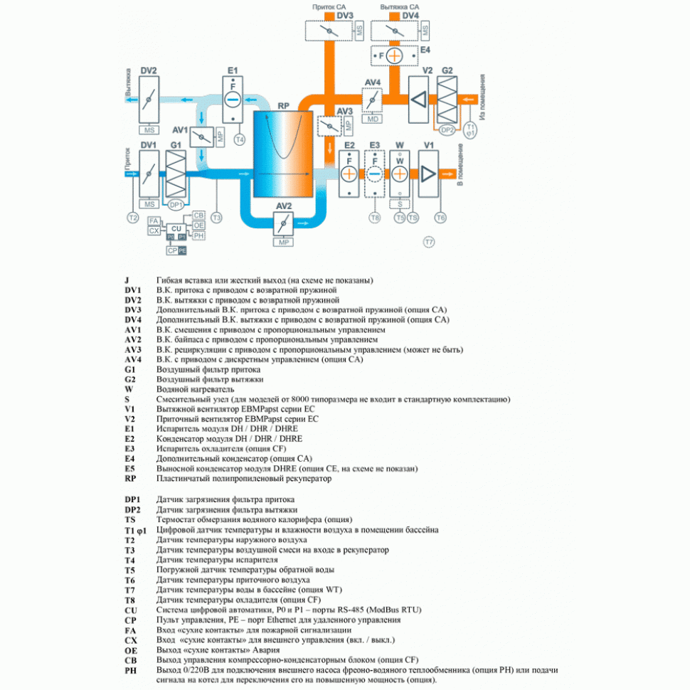 - Возможные опции PH нагрев воды в бассейне WT температура воздуха по температуре воды PW дополнительный водяной калорифер PE управление дополнительным электрокалорифером CF дополнительный охладитель и управление ККБ CH переключение тепло-холод CE выносной конденсатор и переключение тепло-холод CA переключение тепло-холод воздушными клапанами DS диспетчеризация.