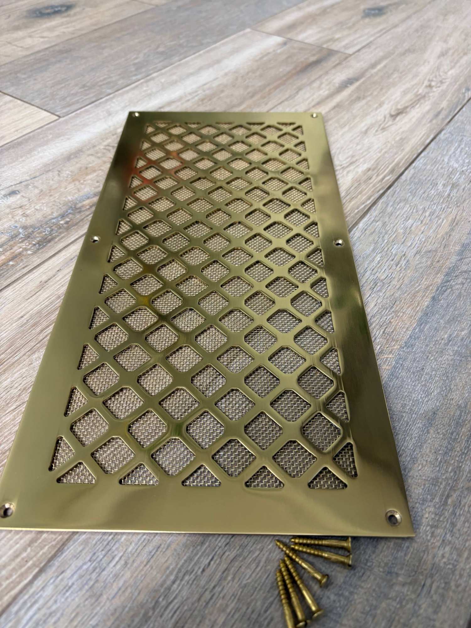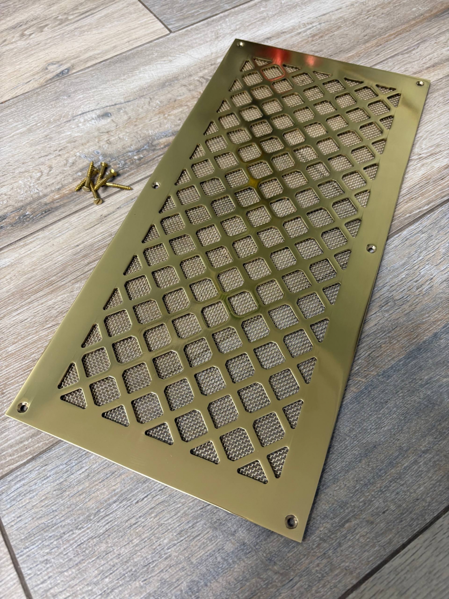 Вентиляционная решётка латунная полированная с сеточкой и шурупами ЛР18 400х200